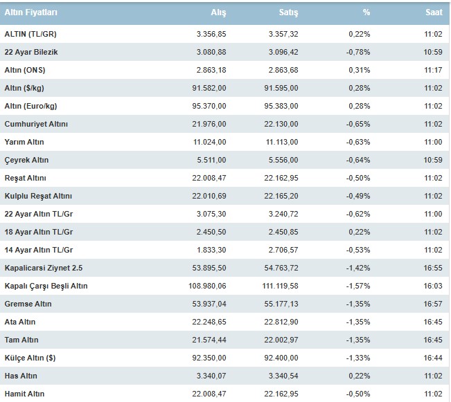 Tam Altın: 21.574,44 TL alış, 22.002,97 TL satış fiyatıyla işlem görüyor.