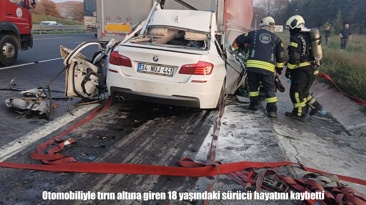 HABER49- Kaza, akşam saat 17.00 sıralarında Kuzey Marmara Otoyolu Balçık gişeleri mevkiinde meydana geldi. 34 NUJ 441 plakalı BMW marka otomobili ile Ankara istikametine seyreden Yunus Emre Z. (18), aynı istikamette seyir halinde olan tırın dorsesine çarptı. Dorsenin altına giren otomobil hurdaya döndü. Olay yerine sağlık, itfaiye ve jandarma ekipleri sevk edildi. Sağlık ekiplerinin yaptıkları kontrolde sürücü Yunus Emre Z.’nin hayatını kaybettiği belirlendi. Sürücü sıkıştığı yerden itfaiye ekipleri tarafından çıkartıldı.