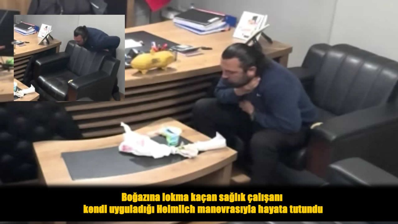 HABER49- Osmaniye'de yemek yediği sırada boğazına lokma kaçan sağlık çalışanı, kendi kendine uyguladığı Heimlich manevrası sayesinde hayata tutundu. Yaşananlar iş yerinin güvenlik kamerasına yansıdı.