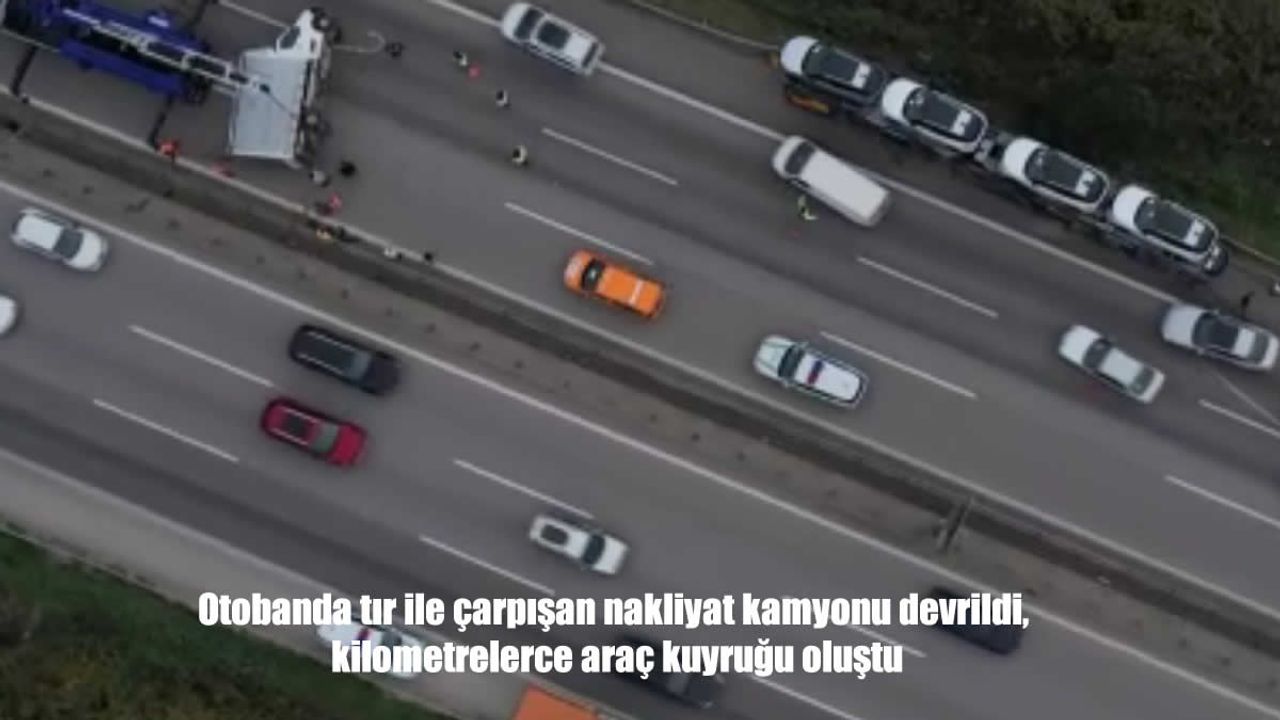 Edinilen bilgiye göre, otoyolun Arifiye ilçesi Adapazarı gişeler mevkii Ankara istikametinde İ.G. idaresindeki 41 TN 907 çekici plakalı SUV tarzı araç yüklü tır ile çarpışan S.Ç. idaresindeki 41 AOH 551 plakalı nakliyat kamyoneti devrildi. Kazada yaralanan olmazken, otoyolun Ankara istikametinde kilometrelerce araç kuyruğu oluştu. Bölgeye jandarma ve kara yolları ekipleri sevk edildi. Kontrollü bir şekilde tek şeritten sağlanan trafik, kamyonetin bulunduğu yerden kaldırılması ile normal seyrine döndü.