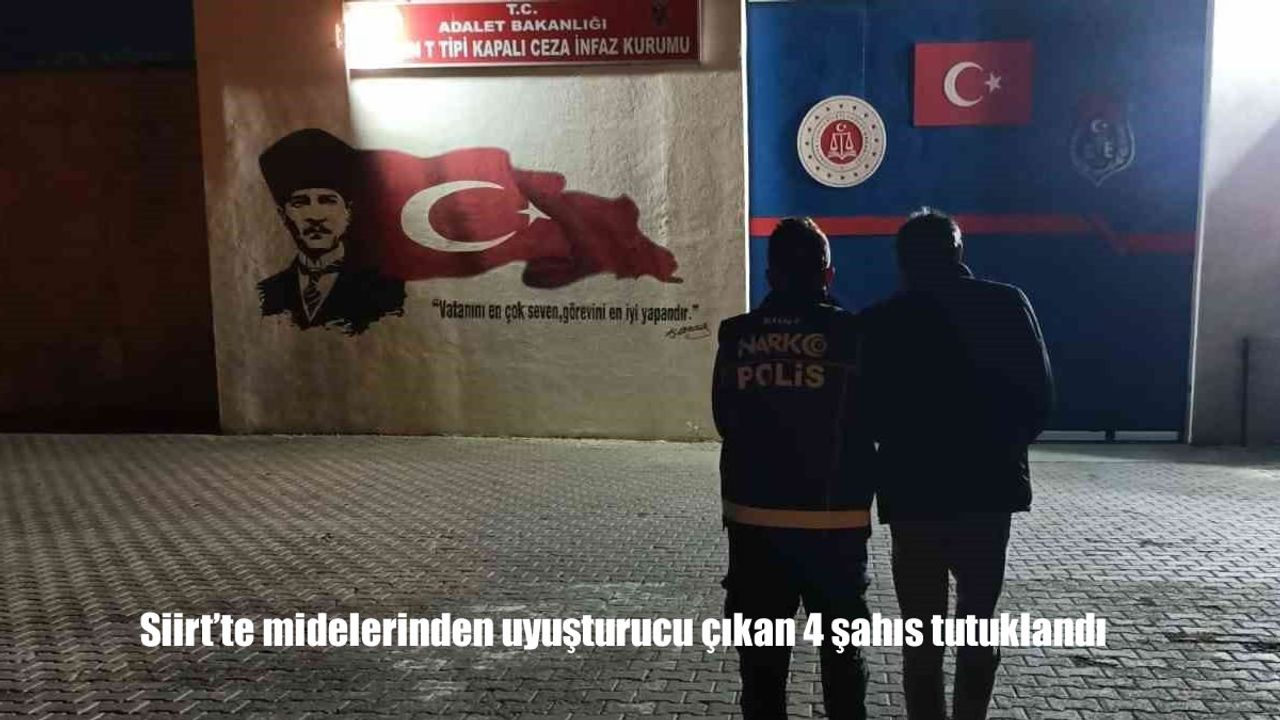 HABER49-Siirt Emniyet Müdürlüğü Narkotik Suçlarla Mücadele Şube Müdürlüğü görevlilerince 14 Aralıkta Baykan Şehit Bünyamin Torgut Polis Uygulama Noktasında durdurulan iki araçta, batı illerine uyuşturucu madde sevk etmek için uyuşturucu maddeleri özel yöntemler kullanarak paketleyerek yutmak yöntemiyle mide kısmında taşıyan İran uyruklu 3 kadın 1 erkek şahıs yakalanmıştı. Şahısların midelerinde bulunan uyuşturucu maddeler 10 gün devam eden hastane süreci sonucunda cerrahi yöntemler kullanılarak çıkartıldı.