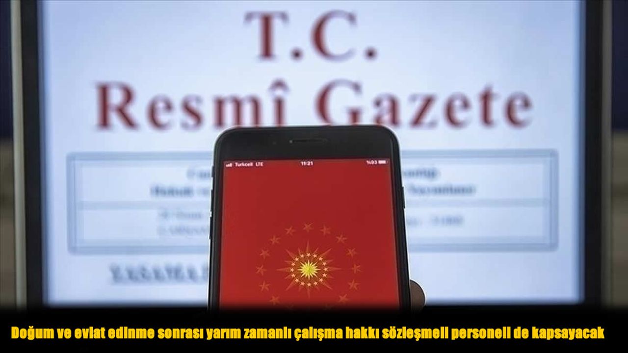 HABER49- Doğum ve evlat edinme sonrası yarım zamanlı çalışma hakkının sözleşmeli personeli de kapsayacak şekilde genişletilmesine ilişkin Cumhurbaşkanı Kararı, Resmi Gazete'de yayımlandı.