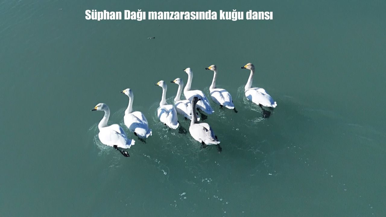 HABER49- Yaz aylarında gölü pembe tonlara bürüyen flamingoların göç etmesiyle bölgede hâkimiyet beyaz renkli ötücü kuğulara geçti. Yaklaşık 200 farklı kuş türüne ev sahipliği yapan Arin Gölü, havaların soğumasıyla birlikte önemli bir göç durağı olarak yeniden canlandı. Bu dönemde göle gelen ötücü kuğular, sakin ve etkileyici duruşlarıyla izleyenleri adeta büyülerken, dronla çekilen görüntüler doğanın sunduğu eşsiz güzelliği gözler önüne serdi. Havadan kaydedilen görüntülerde, Arin Gölü’nün berrak yüzeyinde süzülen kuğuların arka planında yükselen, zirvesi karla kaplı Süphan Dağı dikkat çekti. Kuğular ile dağın görkemi aynı karede buluşunca ortaya kartpostallık manzaralar çıktı.