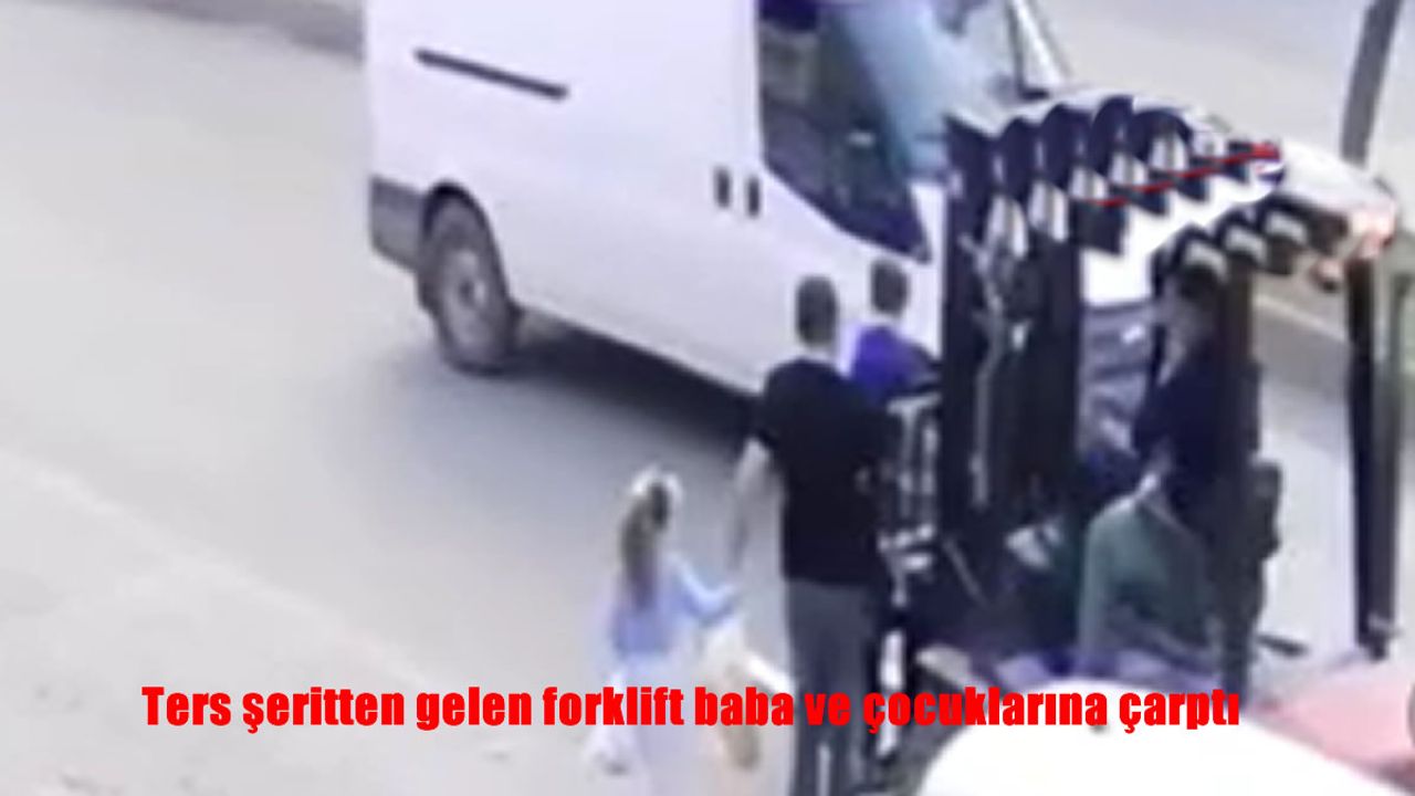 Bir iş yerinin güvenlik kamerasına saniye saniye yansıyan görüntülerde ters şeritten forkliftin gelerek baba ve çocuklarına çarptığı anlar yer aldı.