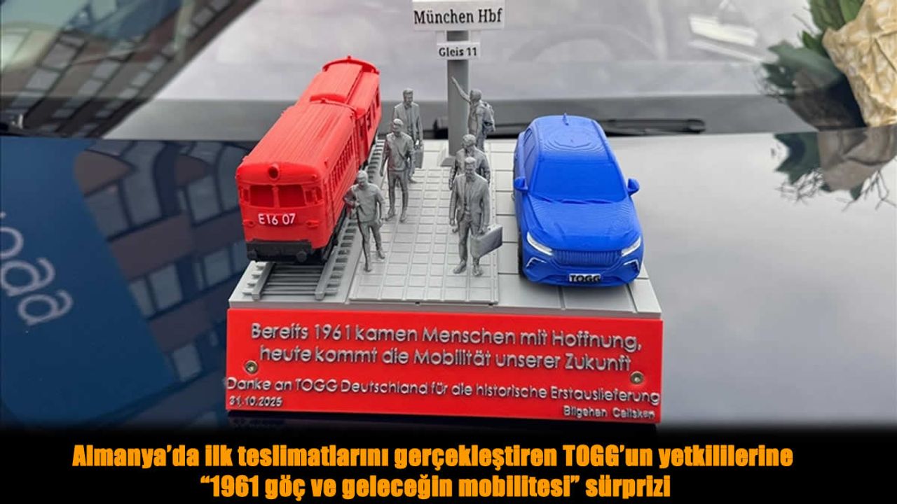 Aracını teslim alan makine mühendisi Bilgehan Çalışkan da üzerinde Münih Tren Garı'na gelen Türklerin ve Togg otomobilin bulunduğu ve “1961'de insanlar umutla geldiler, bugün geleceğimizin mobilitesi geliyor. Tarihi ilk teslimat için TOGG Almanya'ya teşekkürler.” yazılı maketi TOGG yetkililerine hediye etti.