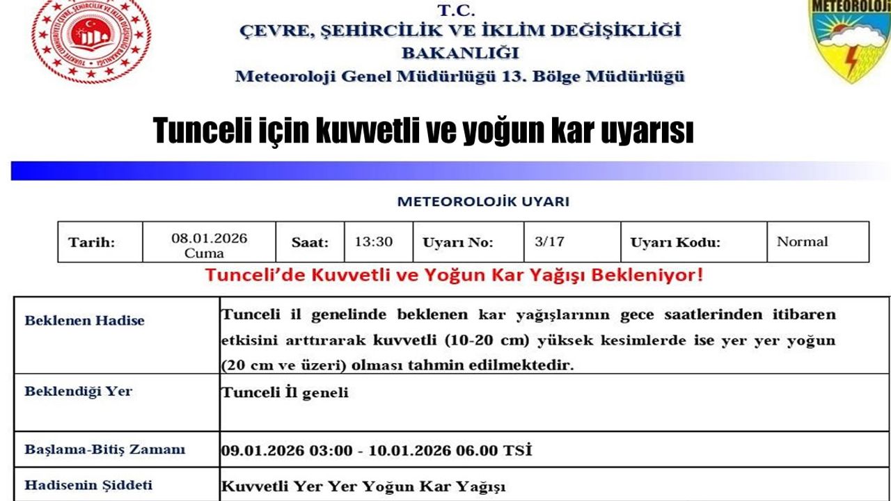 haber49-Meteoroloji 13. Bölge Müdürlüğü’nden yapılan uyarıda, "Tunceli il genelinde beklenen kar yağışlarının sabah saatlerinden itibaren etkisini arttırarak kuvvetli (10-20 cm) yüksek kesimlerde ise yer yer yoğun (20 cm ve üzeri) olması tahmin edilmektedir. Ulaşımda aksamalar, yüksek kesimlerde tipi ile birlikte görüş mesafesinde azalma, buzlanma ve don olayı, yüksek kar örtüsüne sahip eğimli bölgelerde çığ gibi olumsuzluklara karşı dikkatli ve tedbirli olunmalıdır" denildi.