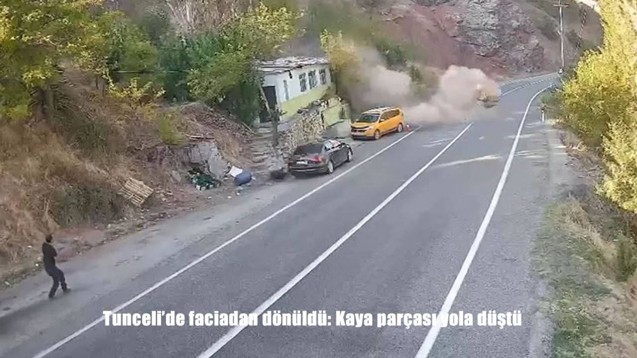 HABER49-Olay, Tunceli-Erzincan karayolu Kutu Deresi mevkiinde meydana geldi. Edinilen bilgiye göre, dağlık alanda kepçenin çalışma yaptığı sırada, kopan büyük bir kaya parçası aşağı doğru yuvarlanmaya başladı. Kaya parçası dağ eteğindeki evi ve yol kenarında park halindeki 2 aracı teğet geçerek dereye yuvarlandı. O sırada bir şahıs koşarak kaçmaya başladı ve yere düştü. Büyük bir facianın eşiğinden dönüldüğü olay, güvenlik kameralarına yansıdı.