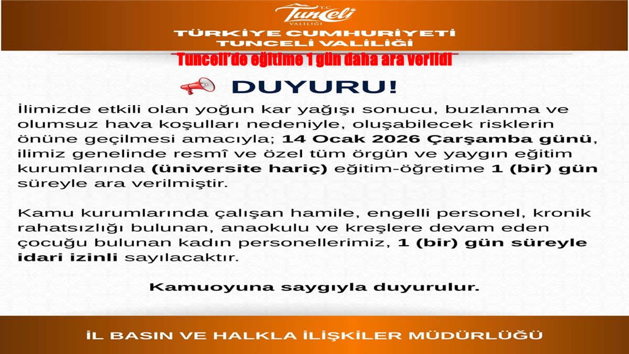 Valilikten yapılan açıklamada, “14 Ocak 2026 Çarşamba günü, il genelinde resmî ve özel tüm örgün ve yaygın eğitim kurumlarında (üniversite hariç) eğitim-öğretime 1 gün ara verilmiştir. Kamu kurumlarında çalışan hamile, engelli, kronik rahatsızlığı bulunan ve anaokulu/kreşe devam eden çocuğu olan kadın personel 1 gün idari izinli sayılacaktır” denildi.