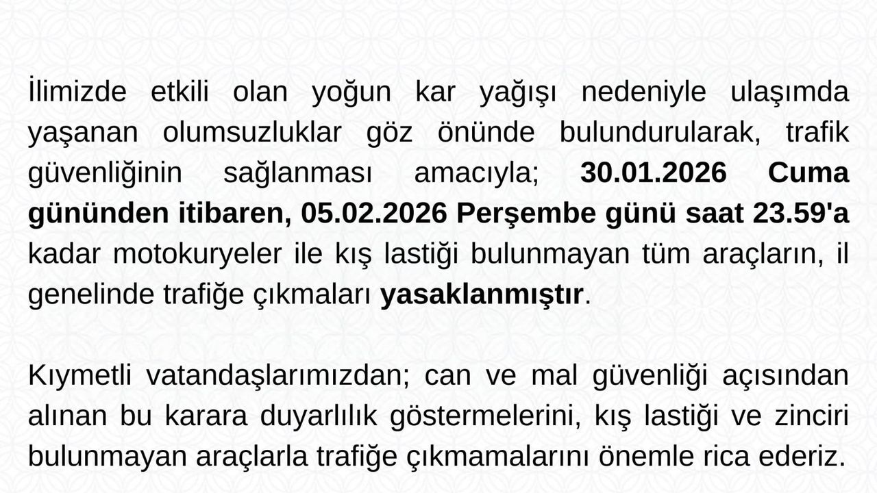 Valilikten yapılan açıklamaya göre yasak, 30 Ocak 2026 Cuma günü itibarıyla yürürlüğe girdi. Karara göre motokuryeler ve kış lastiği bulunmayan tüm araçların il genelinde trafiğe çıkışı, 5 Şubat 2026 Perşembe günü saat 23.59’a kadar yasaklandı. Bu süre boyunca denetimlerin emniyet ve jandarma ekipleri tarafından sürdürüleceği bildirildi.