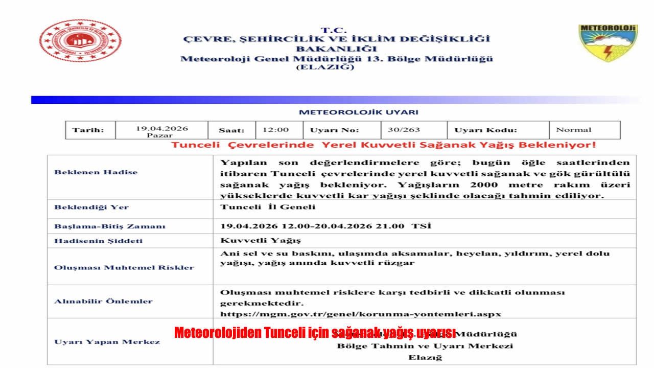 Meteoroloji 13. Bölge Müdürlüğü tarafından yapılan uyarıda, "Yapılan son değerlendirmelere göre; bugün öğle saatlerinden itibaren Tunceli çevrelerinde yerel kuvvetli sağanak ve gök gürültülü sağanak yağış bekleniyor. Yağışların 2000 metre rakım üzeri yükseklerde kuvvetli kar yağışı şeklinde olacağı tahmin ediliyor. Oluşması muhtemel risklere karşı tedbirli ve dikkatli olunması gerekmektedir" denildi.