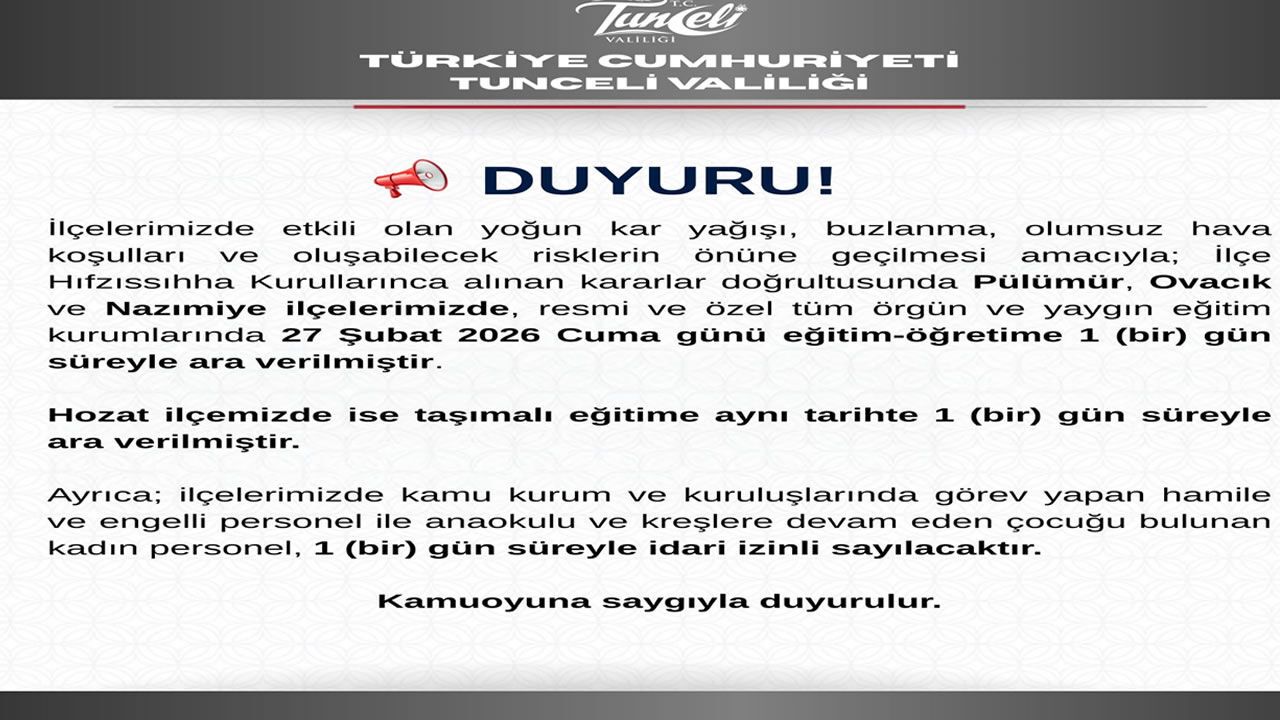 HABER49-Tunceli Valiliğinden yapılan açıklamada, "İlçelerimizde etkili olan yoğun kar yağışı, buzlanma, olumsuz hava koşulları ve oluşabilecek risklerin önüne geçilmesi amacıyla; İlçe Hıfzıssıhha Kurullarınca alınan kararlar doğrultusunda Pülümür, Ovacık ve Nazımiye ilçelerimizde, resmi ve özel tüm örgün ve yaygın eğitim kurumlarında 27 Şubat 2026 Cuma günü eğitim-öğretime 1 gün süreyle ara verilmiştir. Hozat ilçemizde ise taşımalı eğitime aynı tarihte 1 gün süreyle ara verilmiştir. Ayrıca ilçelerimizde kamu kurum ve kuruluşlarında görev yapan hamile ve engelli personel ile anaokulu ve kreşlere devam eden çocuğu bulunan kadın personel, 1 gün süreyle idari izinli sayılacaktır" denildi.