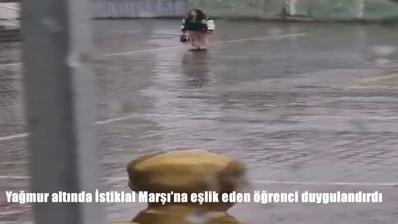 HABER49-Iğdır'da dün haftanın ilk günü tüm okullarda olduğu gibi İnönü İlkokulu'nda da İstiklal Marşı okundu. Kentte etkili olan yağış nedeniyle marş, okulun hoparlör sistemi üzerinden tüm sınıflarda aynı anda okutuldu. Bu sırada derse geç kalan bir kız öğrenci, okul bahçesinde yağmurun altında durarak İstiklal Marşı'na eşlik etti. Marş bitene kadar yerinden ayrılmayan öğrencinin bu davranışı, öğretmenler ve öğrenciler tarafından izlendi. Yağmur altında İstiklal Marşı'nı okurken duygulandıran anlar cep telefonu kamerasına yansıdı.