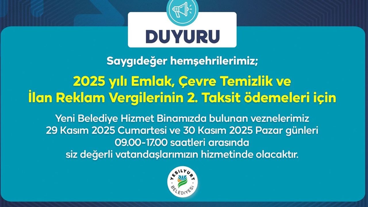 Yeşilyurt Belediyesi Gelirler Müdürlüğü yetkilileri, vergi ödeme dönemlerinde yaşanan yoğunluğun azaltılması ve daha hızlı hizmet sunulması adına bu uygulamanın hayata geçirildiğini belirterek, vatandaşların belirtilen tarihlerde ödemelerini yapabileceklerini ifade ettiler. Yetkililer ayrıca, vergi mükelleflerinin ödemelerini internet üzerinden de kolayca gerçekleştirebileceğini hatırlatarak, hem veznelerden hem de online sistemden yapılacak tüm ödemelerde işlem güvenliğinin üst seviyede olduğuna dikkat çekti.