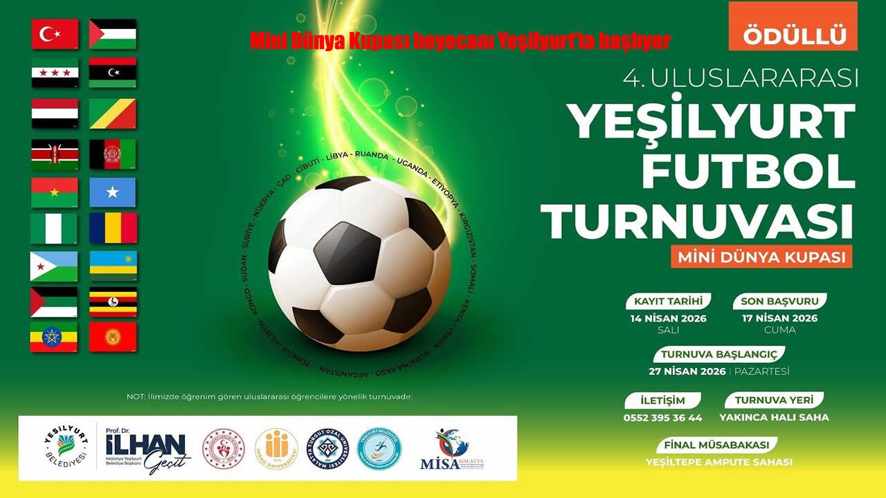 HABER49- Yeşilyurt’ta uluslararası öğrencileri bir araya getirecek “Mini Dünya Kupası Ödüllü 4. Uluslararası Yeşilyurt Futbol Turnuvası” için geri sayım başladı. Organizasyon, farklı ülkelerden gelen öğrencilerin katılımıyla dostluk ve kardeşlik atmosferinde gerçekleştirilecek.